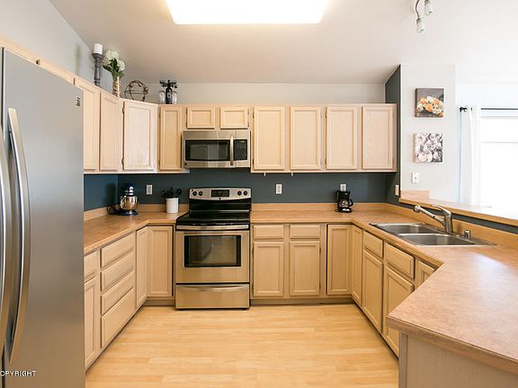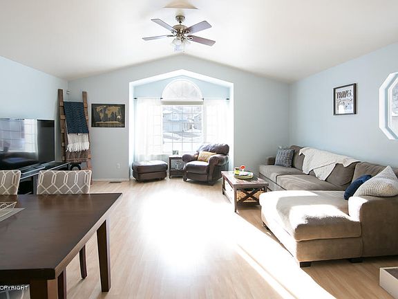 Turn-key home on sun-soaked corner lot. Newly fenced in yard with large deck overlooking a wooded area. Gorgeous new laminate flooring-Autumn scraped oak style- in master bedroom. Convenient location near shopping, restaurants, and services; quick commute access to JBER, Anchorage or Valley.