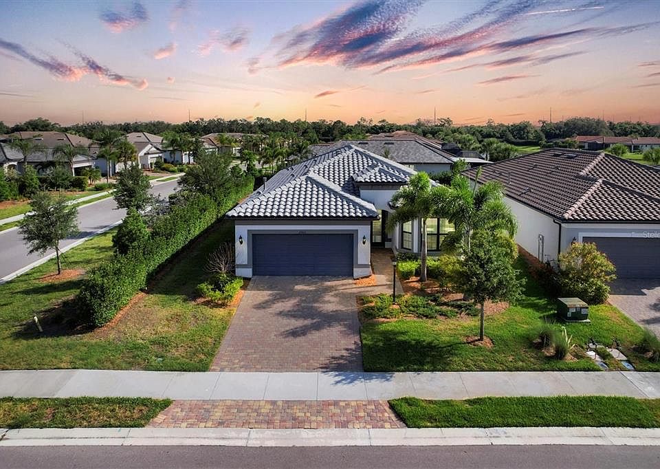 One or more photo(s) has been virtually staged. You've seen the commercials on television, now here's your chance to live in a Del Webb community, right here in Lakewood Ranch! Find out for yourself why everyone that lives here is smiling, and for a lot less money than you would expect. Del Webb Lakewood Ranch is just a few minutes to shopping, restaurants, personal and professional services. A few minutes more and you have choices ranging from Live Polo matches at the Sarasota Polo Club and all the entertainment and exciting things going on at Lakewood Ranch Main Street, or the new Waterside Place! Feeling more adventurous? I-75 is only six miles away, Sarasota-Bradenton Int'l Airport or the Sarasota Bayfront is only 12 miles, and the world-famous, powdery-white beaches of Siesta Key Beach are just a few minutes more! But if you'd rather stay closer to home there's no need to leave to have fun! Your new neighborhood offers a fantastic variety of indoor and outdoor activities, all within walking, biking, or golf cart distance. Indoor gathering areas serve the many social clubs, state-of-the-art fitness center, and performimg arts venue. Outdoors you can take your pick of Tennis, Pickleball, or Bocce. But first, you simply must try out the Jacuzzi or resort-syle pools. And the Zero-entry pool gives you that 'Living at the beach' feel, right at home! Inside you will find a nearly-new, lightly-used home. The light color scheme welcomes in plenty of natural light. Custom upgrades include CAT3 rated windows throughout, good up to 129 mph of sustained wind, a pulldown stairway to the attic above the garage with a reinforced floor for additional storage. And that's just the beginning of the goodies youll find here! An upgraded Laundry with wash tub, a Walk-in shower in the Owner's Bathroom, and best of all, the Zero Corner, Sliding Glass Doors, joining the Gathering Room, Cafe and Dining Area, with the Extended Lanai! The 3 bedrooms are all split from one another and flow nicely with a high level of privacy for each. The Flex Room with its double doors makes for a great study/ home office, or in a pinch, can double as a 4th bedroom for those holiday visitors. Don't pay more for less home elsewhere without touring this one first! Available for immediate showings and occupancy!