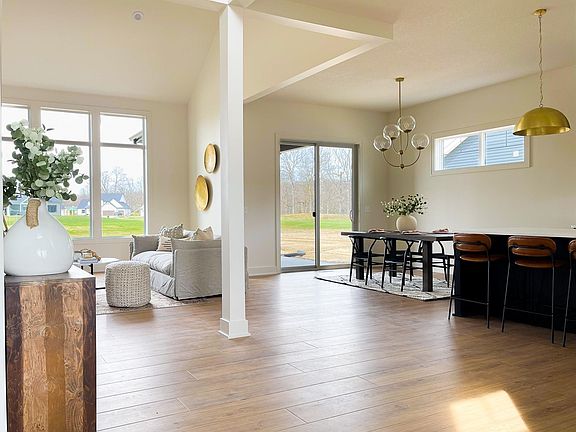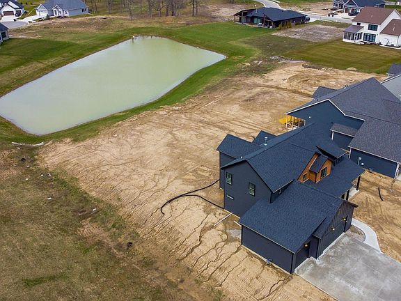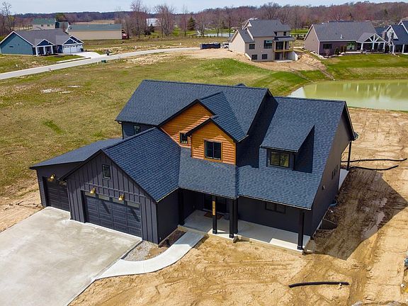 TND HOMES Presents their newest spec home located in Tullymore Run - LEO EACS: Built on a pond lot with scenic water views - 5 Bedrooms 3.5 Baths sits on a fully finished basement. As you enter the home underneath the covered front porch and through the double French doors you will be impressed by the home's open, airy and functional concept. Entertain effortlessly as the main floor layout is spacious and open. Luxury vinyl plank runs throughout kitchen and Great room. Eat-in kitchen showcases hard surface countertops, tiled backsplash, two-toned custom soft close J. Graber cabinetry and huge oversized island. Stainless kitchen appliances with upgraded range w/ kitchen exhaust fan are included. Ample cabinet and countertop space allow you endless possibilities to entertain and cook family meals. Adjoined to the kitchen is the dining room that provides access to the 168sf covered veranda allowing you to enjoy the spacious backyard and magical pond view. The Great Room features a stately 17 foot cathedral ceiling with a gas log fireplace surrounded by stone façade. Master is on the main equipped with Lg walk-in closet, stylish bathroom tile flooring and custom shower. Main floor laundry room with utility sink is located right off the garage. Additional 3 bedrooms are located on the second floor with full bathroom. Bathroom has a vanity with twin sinks and tub/ shower combo.