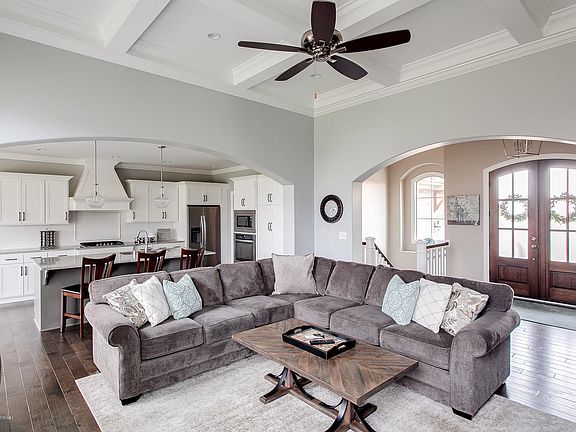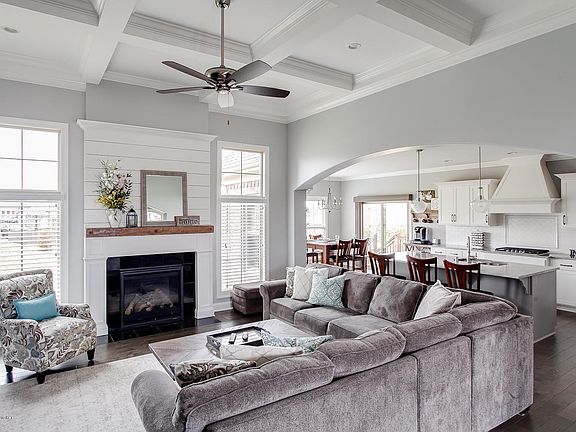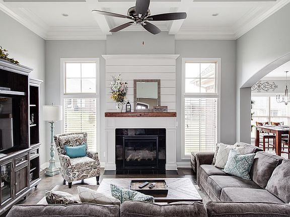 The open design of this home offers elegant space for everyday living, as well as, entertaining. The welcoming foyer features a 12' ceiling and flows seamlessly into the great room. You will appreciate the architectural details in the great room which include a sophisticated coffered ceiling, a fireplace with shiplap detail above the mantle and an arched opening into the kitchen. You will love the gourmet kitchen with sleek custom designed cabinets with classic hardware and granite countertops. There is a large island with seating for four people and stainless Whirlpool appliances including a gas stove. For additional storage, there is a walk-in pantry off the hall. There is elegant handscraped wood flooring in the great room, kitchen, dining area and hallways.