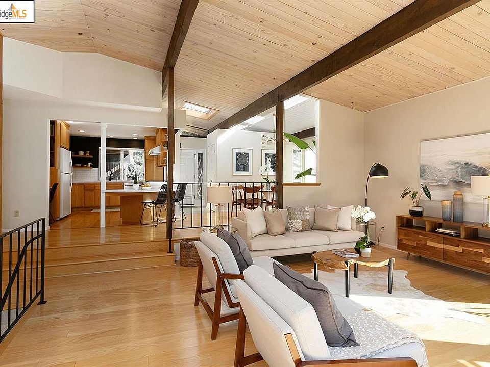 Nestled in a park-like setting, this striking Montclair Mid-Century with an open floor plan is sure to impress! As you enter the home you are immediately drawn to the soaring vaulted wood beamed ceilings and the dramatic floor to ceiling walls of glass that look out to the stunning Redwood Trees and forested views. The main level features a stylish living room that opens out to an expansive deck with beautiful wooded views ideal for relaxing and entertaining, a light-filled dining room, an updated kitchen with quartz countertops and new stainless steel appliances, a bedroom and a master suite with incredible wooded vistas. The lower level offers a large family room that leads out to another spacious deck and wooded garden area, a third bedroom and a bonus room that could be used as a home office complete this floor. This unique property will draw you in with its serenity & beauty of nature. Located minutes to Regional Parks, Montclair Village shops and restaurants & Top-rated school.