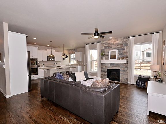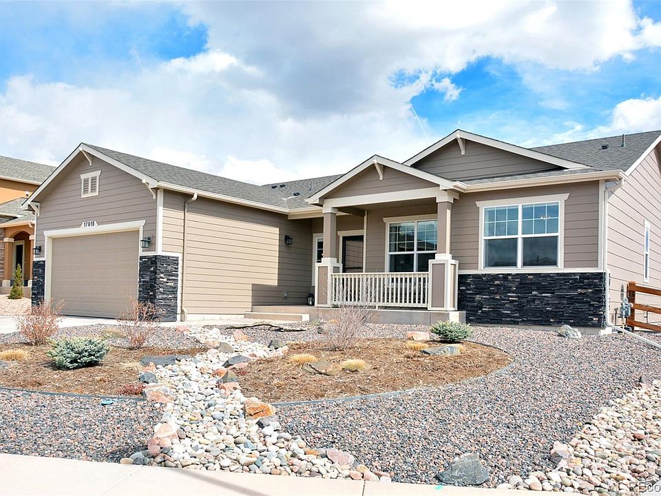 Absolutely pristine, model-perfect rancher, with main level living ideally located on a corner lot in award-winning D38. Check out the mountain views from the low maintenance, xeriscaped front yard or the inviting, covered front porch. The light & bright, main level boasts expansive hardwood oak floors, 9Ft. ceilings, graceful arches, separate dining room, a large master, plus 2 additional bedrooms and laundry. The dramatic great room with a floor-to-ceiling stone gas fireplace opens to the kitchen and walks out to patio. The modern white kitchen boasts granite counter tops, plenty of seating at the huge island/ breakfast bar, a walk-in pantry, and upscale new SS appliances including double ovens. Enjoy outdoor living on the spacious concrete patio - covered by an attractive pergola - and a fully fenced and professionally landscaped yard. The luxurious master retreat is joined by beautifully tiled, 5 pc. spa like bath with soaking tub, dual sinks, granite top vanity, large custom shower and a spacious walk in closet. Sliding barn door separates the bath from the master. The 2 additional bedrooms and a full bath are located in a separate wing from the master. Both could be used as bedrooms or keep one as an office! The mostly finished basement has a huge rec/family room perfect for entertaining - includes snack bar with built-in mini fridge - and is wired for surround sound. 2 additional large bedrooms and full bath make plenty of room for all. An ample unfinished storage room is behind double doors - ready to finish - if desired - or keep it for all that extra storage! This home is immaculate and well-maintained - better than new with upgraded lighting fixtures and blinds. Minutes to I-25 for easy commute to USAFA, Denver or CS. Near parks, trails, schools and shopping.