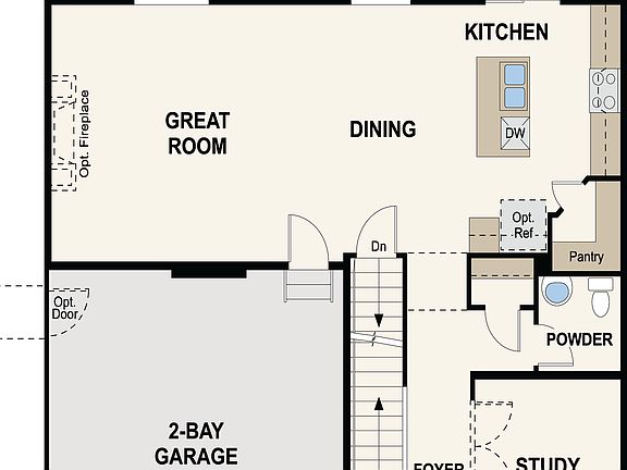 TWO-STORY ; Covered Porch ; 2 Bay Garage with Entry ; Foyer ; Study ; Main Floor Powder Bath ; Open Kitchen with Island, Pantry, and Yard Access ; Dining Area ; Great Room ; Upstairs Laundry Room ; Primary Suite with En-suite Bath and Large Walk-in Closet ; 3 Secondary Bedrooms with Walk-in Closets and a Shared Full Bath ; Standard Unfinished Basement