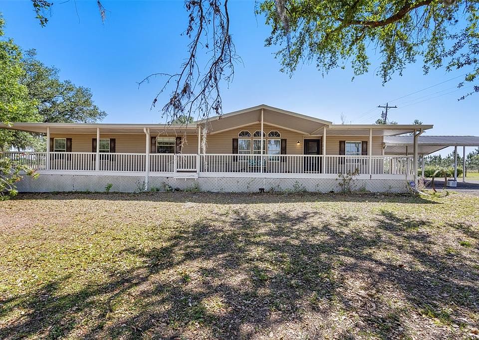 One or more photo(s) has been virtually staged. Enjoy the peace and quiet of living in the country on 5.99 acres of cleared land with a 4 bed 2 bath Jacobson Mobile Home. Inside this home you will find a large family room and dining room which opens to the Kitchen and family room. There is a fireplace in the family room for some cozy cool nights. Off the family room is a large kitchen with an island and eating space which overlooks the front porch and expansive view in the front of the property. When you need an office space, there is one right off the kitchen and primary bedroom. The primary bedroom features a large walk-in closet and primary bathroom with separate shower and garden tub. On the other side of the you will find three more bedrooms and the guest bath. More walk-in closets in the bedrooms and ample storage for the bath and extra items. Enjoy sitting on your covered front porch or have dinner on the large screened in porch in the back. There is also another uncovered patio on the back for your grill. The parking is fantastic as you will have a three-car carport attached to the house. The entire property is fenced and there is a remote gate for access. The outbuildings include a large metal barn with two adjoining side covered parking areas, multiple sheds including a dog run or could easily be turned into a chicken coop. Extra Garden shed, large oak trees, and a backyard view of trees and land. Come make this piece of land your own.