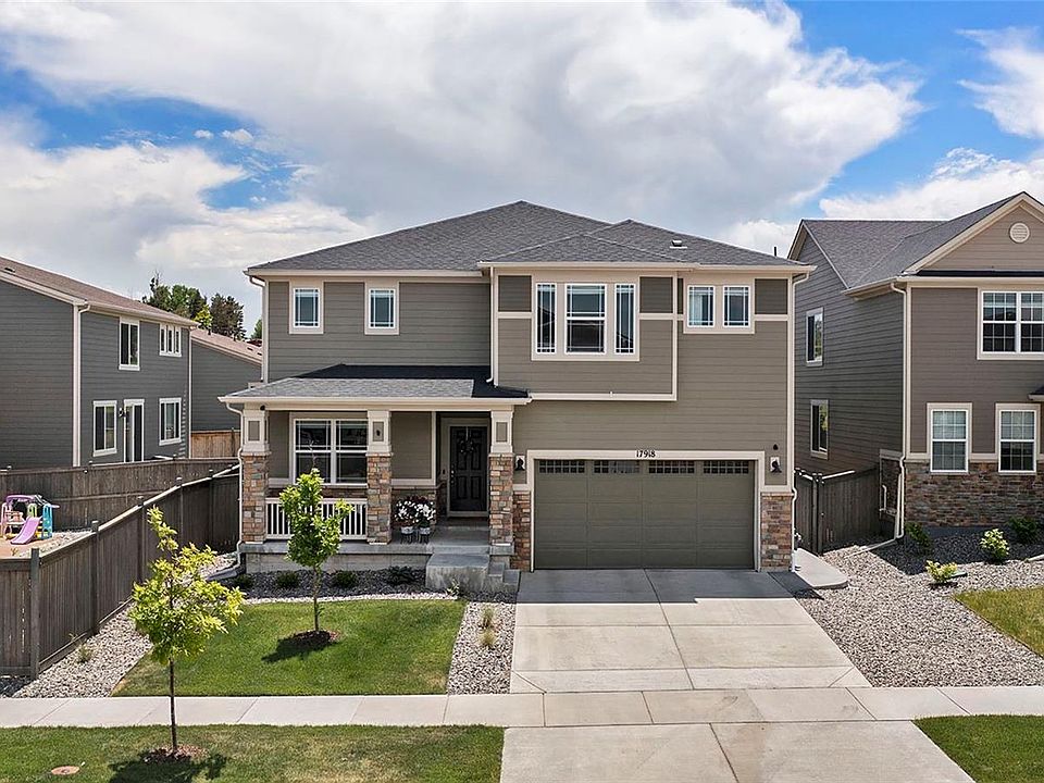 This gorgeous and well-maintained three-year-old home is nestled in the peaceful neighborhood of Meadowlark and is the Goldengate model of Mertiage Homes (a builder focused on energy efficient homes). Positioned in a cul-de-sac, with a private backyard, and minimal traffic, this home has easy access to several main thoroughfares and is in close proximity to downtown Parker and Downtown Castlerock. Enter the cul-de-sac of Marsh Wren Ave. As you walk toward the front entrance of the home, view the highly usable tandem garage space and the lovely front porch with enough space for resting and mingling. Peer down from the porch and view the front yard landscaping improvements. Entering this home, you will be delighted to find a spacious office with double doors and a large, dedicated dining space. The kitchen and living room provide an open floor plan, which is boasting with natural light and airy colors. The eat-in kitchen is designed with Quartz counter tops, a custom Butler’s Pantry, stainless steel appliances, pendant lighting, and a large walk-in pantry. Retreat to the second floor of the home, where there is a large, open, and dedicated loft space. The primary suite includes a full en-suite and walk-in closet. An additional spacious three bedrooms with walk-in closets, two full bathrooms with Quartz counter tops, and an oversized laundry room are also located on the same floor as the primary suite. Tour the backyard, which backs to open space, is extremely low-maintenance, and includes improved landscaping and a fabulous patio space for entertainment. This home is perfectly situated close to all amenities, parks, trails, a splash pad, and offers the ideal blend of comfort and convenience for modern living. View this home today and fall in love.