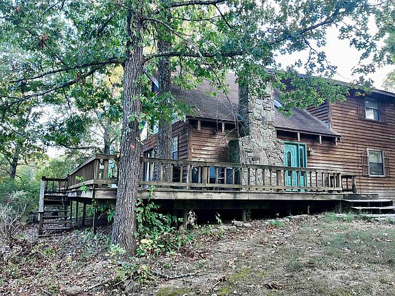 Amazing value for a home on 26 AC M/L in the Ozarks! This charming, 1824 sq ft cabin is built with huge windows and rustic details! You'll love the exposed beams and stone fireplace throughout the open concept living area. The large kitchen has plenty of counter space and a smart layout for big family dinners. Just off the kitchen is a half bath for guests. Laundry room is oversized to fit your deep freeze. The primary bedroom on the main level has a large en-suite bathroom with a double vanity, separate shower, soaker tub, and water closet. Upstairs you'll find two more bedrooms, a bathroom, and an open loft space overlooking the beautiful views. Located just 8 minutes from town, this location is ideal for feeling tucked away, yet close to convenience. Property is home to Morton Creek, a wet weather stream that attracts deer and wildlife. The land slopes downhill off the back of the home, so with a little clearing you could have an amazing valley view to watch the seasons change.