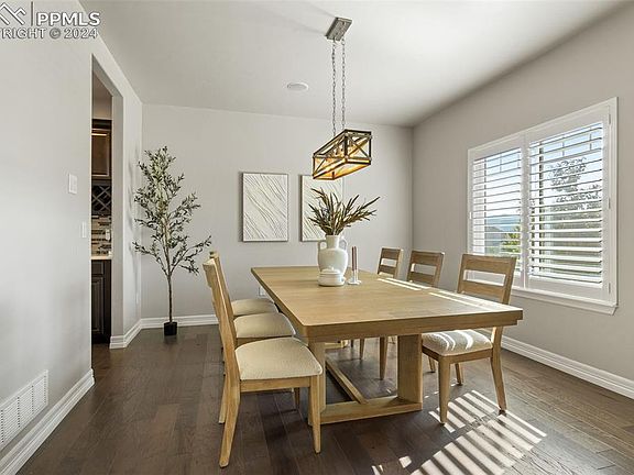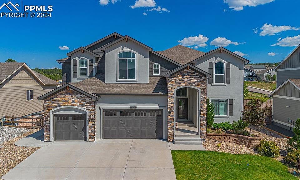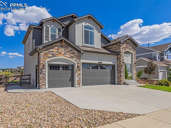 Welcome to this stunning two-story home with a finished basement, three-car garage, and a gorgeous stone and stucco exterior. Located in a quiet cul-de-sac, it offers easy access to the neighborhood while still providing a tucked-away feel. This home is conveniently located close to everything Monument has to offer. This home is situated on an oversized lot with low maintenance deck. This home isn't new but feels new - except better. This home feels more like a semi-custom design, offering unique touches and upgrades throughout including knockdown texture walls with bullnose corners, granite countertops, brand new upgraded carpet and pad, fresh paint, hardwood floors on the main level, Hunter Douglas plantation shutters and automated blinds in the living room, ceramic tile in all bathrooms, and a stone fireplace. It's perfect for entertaining and multi-generational living, with ample storage and a main-level bedroom with a full bath—something you don’t often find in a two-story home. The main level living room boasts windows that stretch all the way up to the second floor, flooding the space with natural light and seamlessly connecting to the gourmet eat-in kitchen with upgraded KitchenAid appliances. You'll also find a formal dining room on this level that can be used as an office, play room or flex space. Upstairs, there are three spacious bedrooms with a shared bathroom, plus a luxurious primary retreat with vaulted ceilings, a sitting area, and a 5-piece primary bathroom. The laundry room is also conveniently located upstairs with full-size cabinets and a utility sink. The basement is perfect for entertaining, with a rec room/theater room equipped with 4 in-ceiling Focal speakers, a stylish wet bar with Kichler lighting fixtures, two additional bedrooms, and a full bath. It also comes with two air conditioning units and two furnaces to keep you comfortable year-round. Don’t miss out on this beautiful home!