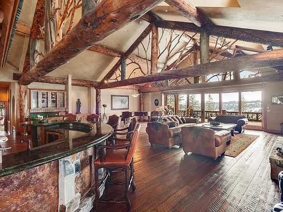 LAKE VIEW EXTRAORDINARY BEAUTY w a One-of-a-Kind open Log and Beam design for grand scale living. Trusses from Montana, stone from Idaho, large sliders to extend your living to the huge wrap around deck overlooking Lake Coeur d'Alene. Four Bedrooms all Suites, theatre, office, 6 bathrooms and more with 6,289sf Mostly FURNISHED. Anchored by a large stone fireplace, gourmet entertaining kitchen w/a special ''Cabin within a Cabin'' wine cellar and bar, Eagle carvings and special luxury touch throughout. Boasting a 3-car garage AND a 3-car carport with heated driveway. End of the Cul-de-sac privacy on an oversized .8-acre lot. Your own retreat, timeless, savvy, artistic, and beyond the ordinary in every way