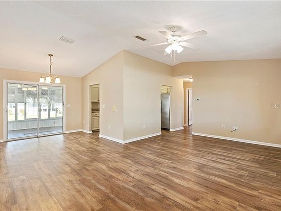 SPRUCE CREEK SOUTH, 55+ Gated Golf Course Community featuring THE LINKS, just north of The Villages. Golf cart access to shopping, physicians, pharmacies, restaurants and more! This 2/2/2 CHESTNUT model home features many updates! Mid tone waterproof luxury vinyl flooring throughout living, kitchen, dining, master, guest bath, and laundry. Carpet in guest room and tile in bathrooms and Florida room. All cabinetry has been updated with beautiful raised panel doors. All cabinet pulls are pewter knobs or drawer pulls. All interior doors are 6 panel with new hardware. Counter tops in kitchen and baths are granite. The Florida room is structural roof, heat and air and features a full width aluminum awning to help shield the afternoon sun. Florida room windows recently updated to sliding acrylic. The lanai is under aluminum roof and is screened with access to fenced yard. There is also a golf cart garage at rear of house in fenced area, with golf cart access through wide gate. The master bed and bath has had a shower make over for expanded shower area and sports a popular 6 panel sliding barn door for ease of access. With updated roof and air conditioning, this one actually has all the updates you are looking for! Walking distance to community center, pool, tennis, and nature park with walking trails. Roof 2018 HVAC 2019 FL room windows 2019 VIRTUAL TOURS ATTACHED TO LISTING Tour 1 is Home and Grounds Tour 2 is Spruce Creek South Community.