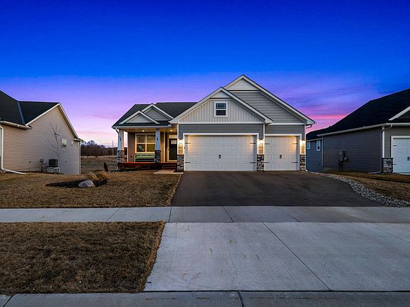 Beautifully maintained & thoughtfully designed, this 4-bedroom, 3-bath walkout rambler in Revere Place offers contemporary style, comfort & functionality—just steps from Cleary Lake Park! The open-concept main level is filled with natural light from oversized windows and features a bright living room with a tray ceiling, recessed lighting, and transom windows. The kitchen is a dream for entertaining, boasting white shaker cabinetry, quartz countertops, a subway tile backsplash, stainless steel appliances, and a spacious walk-in pantry for extra storage. Work from home with ease in the dedicated office with dual windows. The serene primary suite includes a recessed ceiling, transom windows, a large walk-in closet, and an en-suite bath with dual sinks and a walk-in shower. The finished walkout lower level is designed for relaxing or gathering, complete with a stone fireplace, a large family room, and two additional bedrooms, and a rough-in for a future wet bar and bathroom.