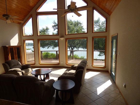 This beautiful single story, waterfront home offers a spacious floor plan, loads of natural light & breathtaking views of Lake Travis*Features include tile & hardwood flooring* granite counters*SS appliances*The oversized Master has lg walk-in closet, garden tub & walk-in shower*Multi-purpose rm currently a bunk room making 4 Beds*Multiple outdoor spaces including outdoor shower, deck, bluff patio, lower deck & flat, fenced yard*Negotiate furniture & dock, & enjoy all Lake Travis has to offer this summer