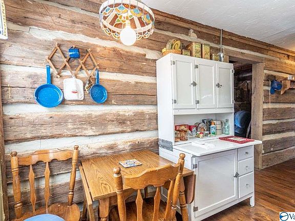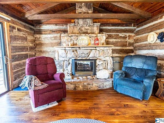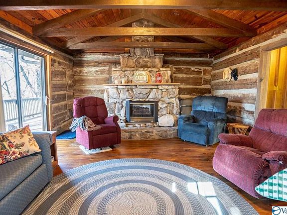 Mentone Mountain Getaway On 1.5 Acres! This rustic tree top cabin features rock fireplaces in BOTH the living room and bedroom! Exposed beams, wood walls, and pine flooring. Cozy as can be with 2 bedrooms, 1 full bath, and glass doors that open to a spacious deck for evening star gazing.