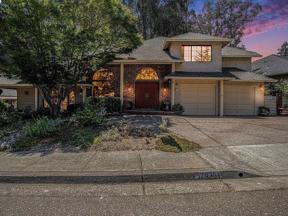 This Upper Valley Custom 3,158 sq ft, 4 bedrooms, 2.5 bath home has been lovingly cared for by the original owners w/designer touches throughout! Situated on an .18-acre lot w/large deck, wooded views & drought tolerant landscaping. Enter the double front doors to impressive foyer w/stairs down to formal living & dining room w/wall of windows, coffered ceiling & additional stairs to family room w/fireplace & raised hearth, beautiful vaulted wood ceiling & French doors to the exterior front of the home. Next to family room is a modernized ½ bath for guests. Updated kitchen w/Quartzite counters, tile flooring, ss appliances, including gas cooktop, built in oven, microwave, dishwasher, wine fridge & pantry, all opening to eating area w/slider to expansive back deck, great for relaxing or entertaining. Up the newly carpeted stairs is the primary bedroom w/double doors, walk-in closet, additional closet & sitting area. Primary bath includes new LVP, double sinks, jetted tub, stall shower & vanity sitting area. Hall bath w/double sinks and shower over tub. 3 additional bedrooms, one w/walk in closet. Upstairs laundry room w/washer & dryer. Add'l features include stainless appliances, upstairs air conditioning, engineered hardwood flooring & 2 car oversized garage.