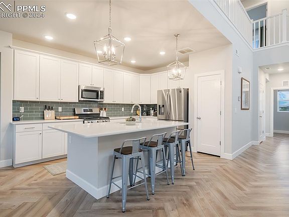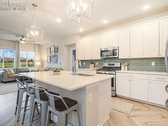 Welcome to your dream home, where comfort, timeless style, and modern amenities come together in perfect harmony. This immaculately maintained property offers the best in main-level living, designed for your convenience and enjoyment. The main level features a spacious primary suite, complete with a step-in shower and dual vanities, providing a serene retreat at the end of your day. The kitchen is a true chef's delight with its crisp white upgraded cabinetry, including 42" upper cabinets, stunning quartz countertops, and a custom backsplash that adds a touch of elegance and personality. The stainless steel appliances complete this beautifully appointed space, making meal preparation and entertaining a breeze. The open-concept living room and dining area are perfect for gatherings, with a neutral color palette and stylish LVP flooring laid in a herringbone pattern throughout, creating a cohesive and inviting atmosphere. Also on the main level, you'll find a convenient powder room and laundry, adding to the ease of everyday living. Upstairs, there are two additional bedrooms, a full bathroom, and a cozy loft, offering flexible space for a home office, playroom, or second living room. Step outside to your covered front porch or back patio, where you can soak in the breathtaking mountain views and the peacefulness of the open space that backs the property. The backyard is enclosed by a beautiful concrete split rail fence. Additional practical features include a south-facing driveway for quick snow melt and a two-car garage. The HOA takes care of snow removal, trash, and exterior structure maintenance, ensuring a hassle-free lifestyle. Plus, the property’s proximity to the scenic Santa Fe Trail makes it an ideal location for outdoor enthusiasts. With its luxurious finishes, modern conveniences, and connection to nature, this home offers everything you’ve been looking for. Don’t miss the chance to make it yours!