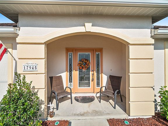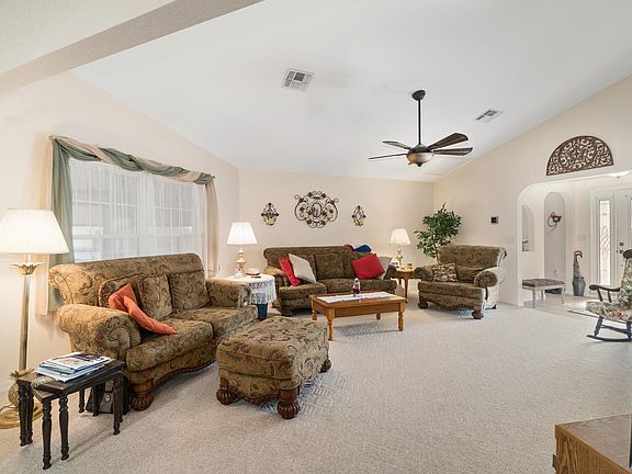 Spacious home in Stonecrest--near The Villages! 3 bedrooms and 3 full baths offering a spacious guest suite. Open floor plan and volume ceilings. Kitchen features a breakfast bar, casual dining nook and dining area. Enclosed lanai with air and open patio for grilling. Master bath with dual sinks, tub and shower. Tray ceilings in the Master bedroom and plenty of closet storage. Newer AC. Stonecrest has 24 hr. manned security gate, 4 pools, pickleball, softball, state-of-the-art Community Center with numerous Clubs and activities for an enjoyable lifestyle. All this and more are included in HOA fee. 27 holes of golf for additional fees. No Bond -No CDD