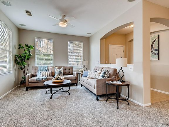 Fresh and clean, this immaculate two-story end unit townhome features new paint and new carpet throughout! Enjoy a low maintenance lifestyle in a home that has a wonderful, open layout with an abundance of natural light, a 2-car attached garage and fenced patio and garden area to enjoy al fresco dining or simply soak in the beautiful Colorado sunshine! The living room has a niche for your TV and entertainment system, surround sound and a cozy gas fireplace. The open kitchen features great counter and cabinet space, a breakfast bar, dining area and walk-in pantry storage. The main floor includes a 3rd bedroom with nice corner windows looking out to the common area and entrance, a 3/4 bathroom with step-in shower, and a good-sized laundry/mudroom with closet storage at the garage entrance. The second floor landing area provides a small area for a desk or library and separates the owner's suite and second bedroom suite. The spacious owner's suite boasts a walk-in closet and large 5-piece bath complete with step in shower and soaking tub while the second upstairs bedroom has its own ensuite full bath and walk-in closet. Enjoy all the outdoor parks, trails, open spaces, water and recreational amenities that Reunion is popular for while being just 30 minutes to downtown Denver, an EZ commute to Boulder and just minutes to DIA, Barr Lake State Park, Buffalo Run Golf and more! This wonderful home is ready to go and is a true must see!