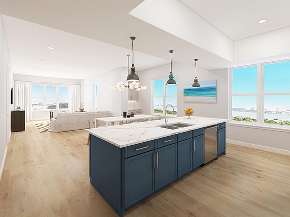 Experience endless sunsets in this SW corner plan with elevated 10' ceilings. The large gallery foyer leads you past the guest suite wing to the stylish open great room boasting walls of windows and a wine bar. Custom cabinetry, quartz counters, and ss appliances complete the stylish kitchen. Access to the 111 sq ft terrace can be found in the living room offering the perfect gathering place. This five-story building hosts a clubhouse, fitness facility, heated pool, hot tub, putting green, and playground. With comfort and safety in mind, this unit boasts impact rated and insulated glass, full fire sprinkler protection and an added level of privacy with 1 ¾ solid core interior doors and concrete block walls between adjoining residences.