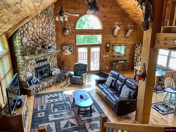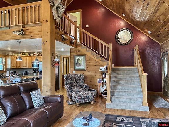 This beautiful log sided home sits on 10 beautiful acres with pasture, pond and a stream that flows thru the property. The blacktop driveway with Bradford Pear trees winds back to the home just makes you feel good all over. The coy pond with fountain just off the covered front porch will relax you from your long day. Home has spacious open floor plan and gorgeous river rock fireplace and beautiful hardwood floors, 20ft tongue and groove cathedral ceilings. Kitchen has custom cabinets and granite countertops This home has 2 master suites, one on the main level and one upstairs. The other 2 bedrooms are in the lower level as well as the family room and game room. There is also a storm room in lower level. Laundry room is on main level. There is a 32X28 detached garage and 53X34 barn for toys or animals. Property has 2 wells, one for home and one for barn. The private pond you will enjoy all year round, it is stocked and lots of wildlife to enjoy.