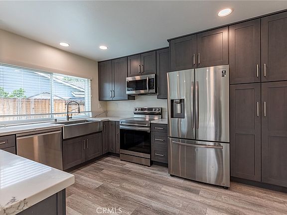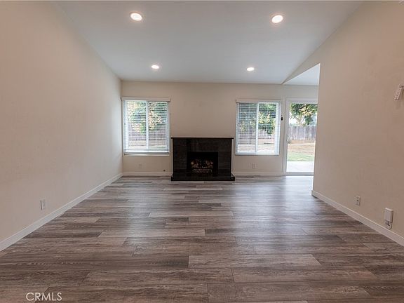 This 4-bedroom, 2-bathroom home sits on a 10,200 square foot lot and offers a functional layout with thoughtful updates throughout. The open living area includes vaulted ceilings and a fireplace, creating a comfortable central gathering space. The custom kitchen features marble countertops, stainless steel appliances (refrigerator included), and an adjacent dining area that opens directly to the backyard.
