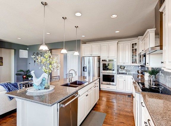 This home was built in 2015 and is beautifully appointed. It is a ranch style home w/a professionally finished basement. On the main floor you will find the master suite complete w/5 piece bath, a 2nd bedroom and a study w/french (easily be converted to a 3rd bedroom.) The family room & kitchen are adjacent creating an open living concept. The fabulous kitchen is finished tastefully w/quartz counter tops, stainless steel appliances, double ovens, white french country cabinets, classy light fixtures and beautiful hardwood floors. There are several options for seating in the kitchen: ample space at the island for at least 3 bar stools and a large breakfast nook. The basement adds another living area complete with wet bar and cabinets, a bedroom and full bathroom. This home backs to open space and has unobstructed, gorgeous mountain views. You will enjoy the outdoor space provided on the covered patio, covered deck or front porch!