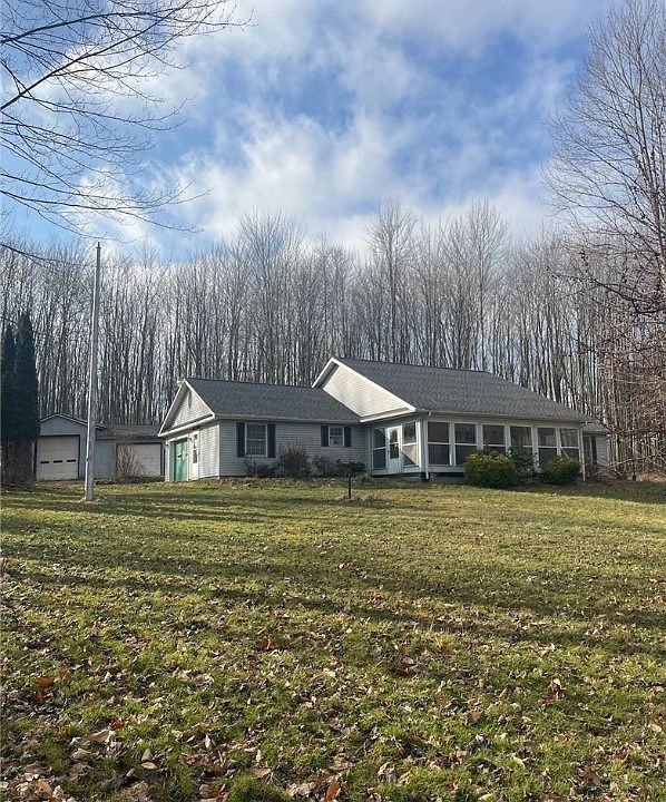 One floor living at its best!! This sprawling two-bedroom ranch offers an open concept in the living and kitchen area with a fireplace and bar as a focal point. The home sits on just over 7 acres with a pond, a pavilion and a detached 36x36 outbuilding for all your toys. Located on a dead end street this property is very private. Don't miss this one!!