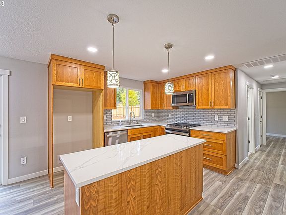 • Features: Dishwasher, Disposal, Island, Microwave, Updated Remodeled, Free Standing Range, Laminate Flooring, Quartz
