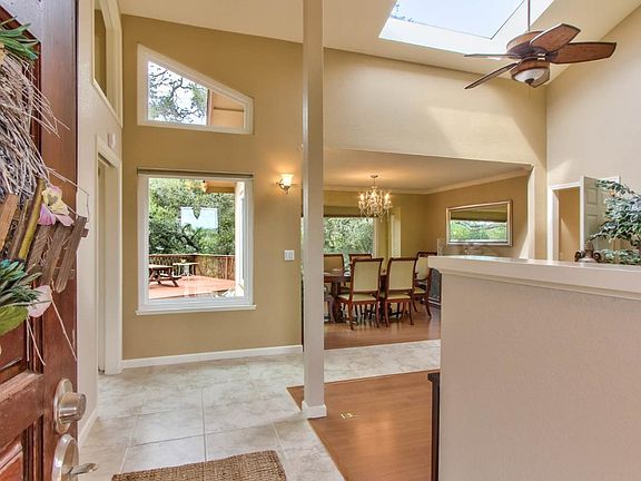 Beautifully renovated spacious home with wall of windows & skylights for sunlight, enter the openness of the living room and a large formal dining room offers views of the deck overlooking the acre of shaded oak trees. Open kitchen features a touch of modern w/custom cabinetry, granite counters, and an antique wood-burning stove step onto the deck and enjoy the sunrise from the kitchen & separate eating area steps away and enjoy the backyard deck. Home offers both indoor and outdoor entertaining. Master Suite, with full bath with travertine tile and granite counter and walk-in closet with second bedroom grace the first floor. The second floor features the customary bonus room perfect for a personal office or easily transform into guest accommodations with a full bath with travetine, the upper deck offers mountain views. Fabulous layout w/radiant floor heating on travertine tile and hardwood floors. Driveway has ample parking and turn-around space for special occasions.