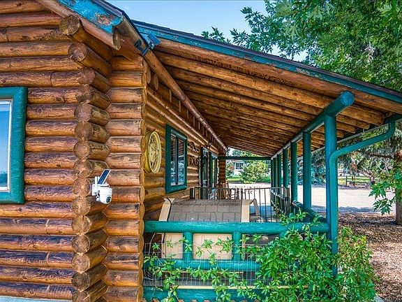 Mature shade treesInviting cabin-style designCovered front porchLong gravel circle drivewayLog-style exteriorSpacious green front yardFlat usable yard space
