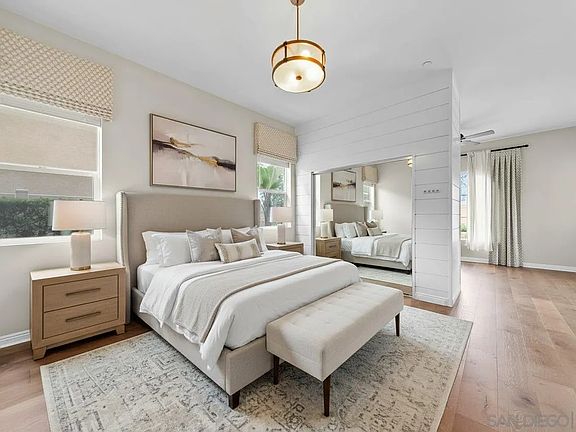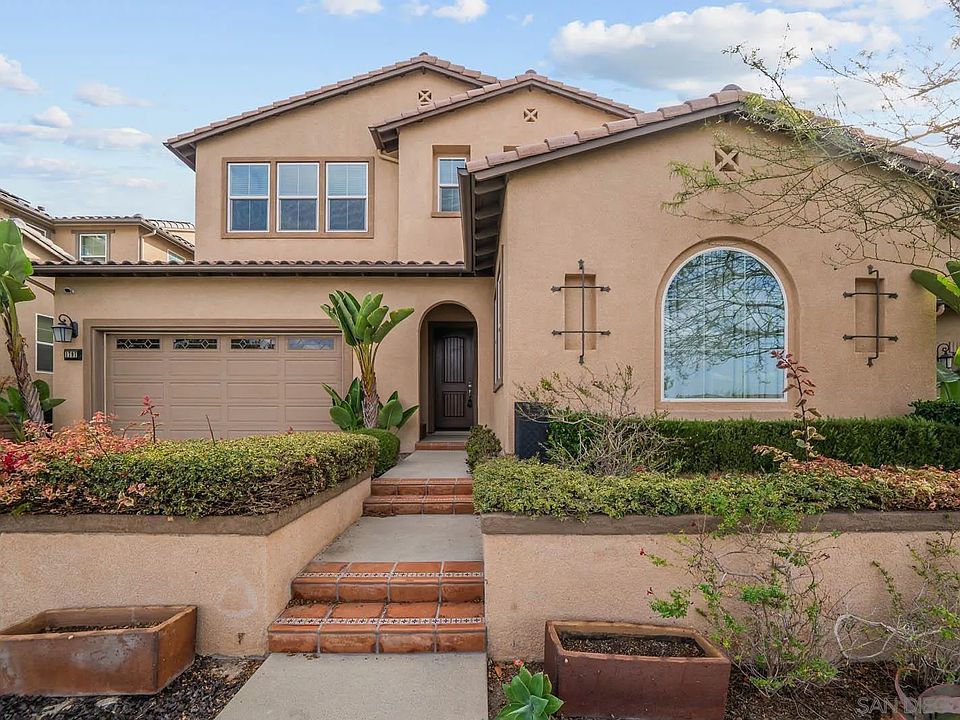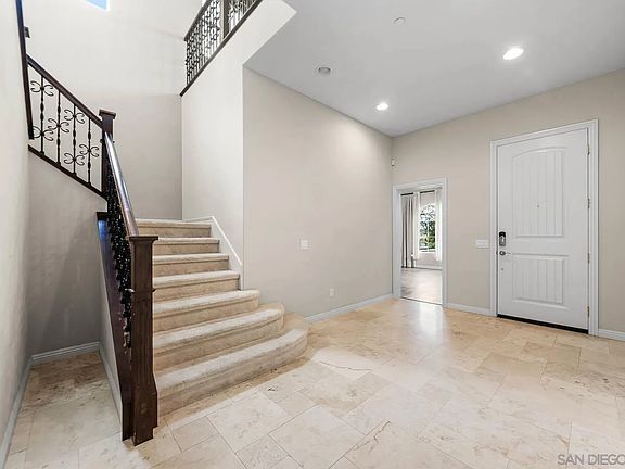 Former model home with dual primary suites (one downstairs), a spacious loft, and a chef’s kitchen with a massive granite waterfall island and premium KitchenAid appliances. Turnkey, bright, and located in the desirable Otay Ranch area. The chef’s kitchen is a true centerpiece with a massive granite waterfall island, KitchenAid 6-burner range with griddle and pot filler, double ovens, large walk-in pantry, and abundant counter and cabinet space. The kitchen flows seamlessly into the dining area and great room with surround sound and large windows for natural light. Downstairs highlights include elegant travertine tile flooring throughout, an iron staircase, and an open-concept great room designed for entertaining. The first-floor master suite offers privacy and comfort, perfect for multi-generational living or hosting guests, and includes its own full bathroom for convenience. Upstairs, the second master retreat features custom built-ins, a spa-like bath with soaking tub between dual vanities, a huge walk-in shower with floor-to-ceiling tile, and an oversized walk-in closet. Outdoor living is complete with a covered travertine patio, Napoleon electric fireplace, trellis with built-in BBQ, and landscaped yard. Additional features include epoxy garage flooring with EV pre-wire, leased solar, tankless water heater, and water softener system.