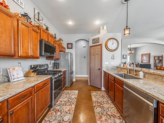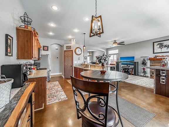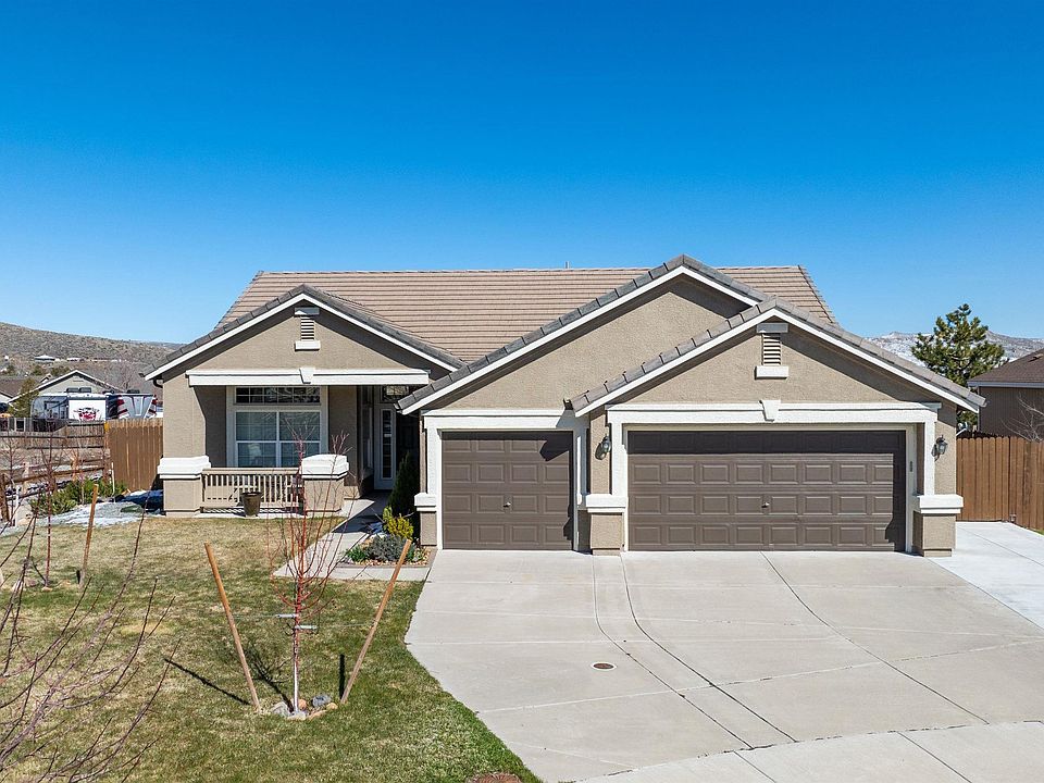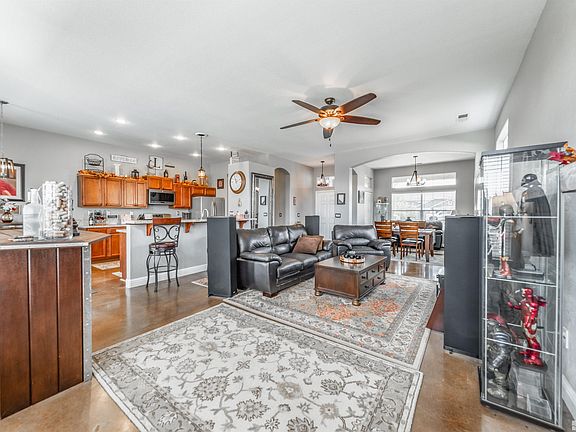 Welcome to your dream home nestled in a peaceful cul de sac, boasting BLM land as your scenic neighbors. Imagine starting your day sipping coffee on the front porch, greeted by breathtaking mountain views and the serene expanse of open ranch land. Still close to town, this property offers the perfect blend of tranquility and convenience. The exterior of this home has been recently professionally painted, adding to its charming curb appeal. Step inside to discover the beauty of stained concrete flooring, throughout the living areas, combining a sleek modern aesthetic with easy maintenance. The open-plan living room and kitchen invite you in with soaring ceilings and expansive windows that flood the space with natural light and showcase the stunning surroundings. Cozy up by the gas fireplace or seamlessly transition to the backyard for al fresco dining and entertaining on the patio. Off the entry, a versatile den awaits, ideal for dining, a home office, or additional living space to suit your needs. The well-appointed kitchen boasts new appliances including a dishwasher and oven, alongside a pantry, breakfast bar, and breakfast nook, making it a central hub for culinary delights and social gatherings. Retreat to the main bedroom, your personal oasis for relaxation and rejuvenation. The large backyard beckons with its inviting patio, perfect for hosting BBQs and enjoying the panoramic views of mountains and open range land right from your own yard. A new shed with double doors provides ample storage space for gardening equipment and outdoor items. No need to worry about parking—this home offers a spacious driveway a 3-car garage, additional parking pad, and RV parking on the side, ensuring plenty of space for your vehicles and outdoor toys. Don't miss the opportunity to make this remarkable property your own, where every day feels like a vacation in paradise.