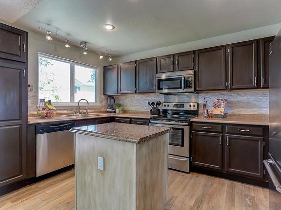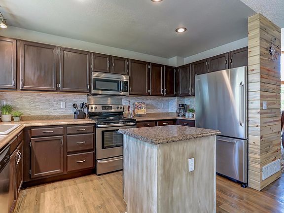 Hutchinson Heights home located close to schools and green belt w/trail access. Dining rm accommodates 2-story ceiling and bright bay wndw. Ktchn provides new SS appliances, stone tile bksplsh plus espresso colored cabinets, island, eat-in area and pantry closet. Gas frplc in living rm w/brick surround, cedar beetle kill accent wall & bay wndw. Upper lvl master bdrm has ample storage in walk-in closet and a private bath w/updated mirrors and a unique dual granite surfaced vanity. 3 secondary bdrms share a hallway bath w/a new white vanity and matching linen cabinet. Finished bsmt complete w/rec rm, ½ bath & flex space which can be used as a hobby rm, play room or study space. Open rec rm has dimmed lighting and wired for surround sound speakers. Upper lvl carpet replaced in May 2017. Wndws, seamless gutters and roof 2yrs old. Exterior living can be enjoyed on the back paver patio or side gazebo area in the fenced bkyrd. Utility shed provides storage for lawn and gardening tools.