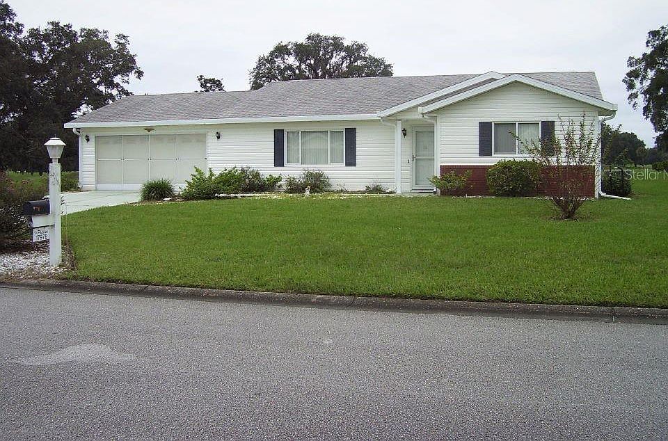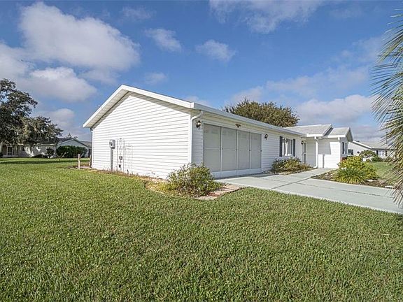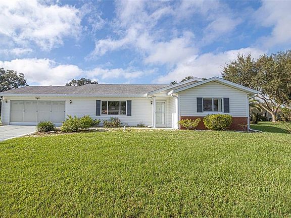 Palm model with great view of the golf course. Split bedroom floor plan with cathedral ceilings, new laminated plank flooring in entry, dining room and kitchen. New carpeting in both bedrooms and living room. Relax in the large enclosed lanai and patio that look out onto the golf course. Lanai is under regular house roof. Super large kitchen with lots of cabinets and counter space, skylight and lighting over cabinets provide a light and bright kitchen. New stainless refrigerator and new dishwasher. Painted driveway and walk, garage extended 4ft with lots of cabinets, newer washer and dryer. New A/C in 2016, roof 2005. Located in Spruce Creek South, a gated 55+ golf course community with lots and lots of activities. Only a few minutes' drive to shopping, restaurants, entertainment and medical facilities. Furniture & Furnishings available separately.