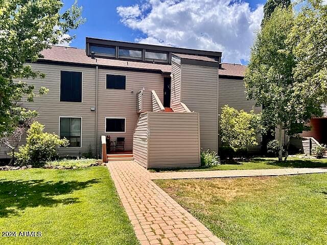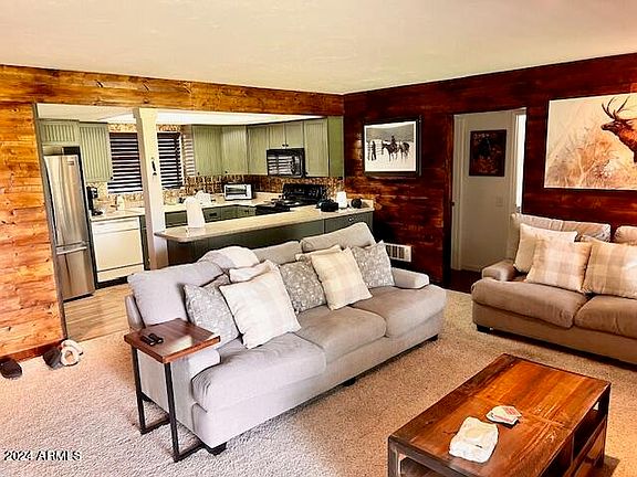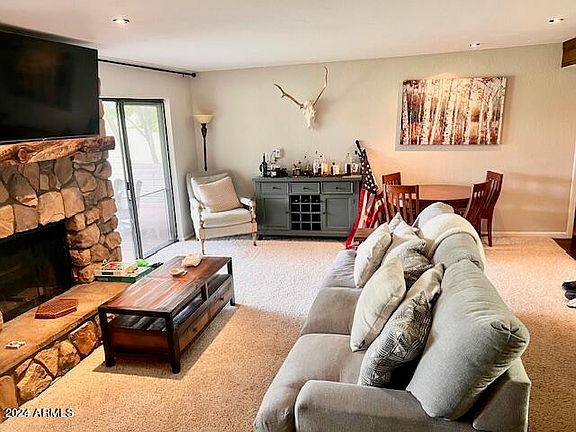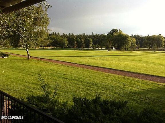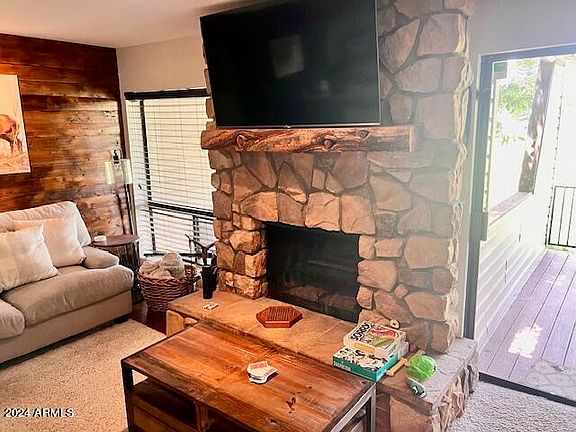 RARE, LOWER-LEVEL Beautiful updated 3 bedroom, 2 bath condo located on the 10th hole of the Pinewood Country Club golf course. NO STEPS to climb and this unit can be used YEAR-ROUND! Relax on the wonderful, covered patio and take in the spectacular, panoramic, unobstructed 180 views of the golf course, forest and sunsets! Patio has ceiling fan, party lights and custom roll down sunscreen. Building is set back, so no worries about being hit with golf balls! Split floor plan with large master on one side and separate entrance to patio. Updated kitchen, cabinets countertops, ceiling, recessed lighting, baths and bedrooms. Luxury wood plank flooring upgraded carpet and window coverings. Rustic rock wood fireplace with custom mantle, upgraded ceiling fans, Custom old rustic wood accent wall and barn door. Comes FULLY furnished with higher end furniture and beds, full size washer and dryer. Your new condo is steps to the well-known Pinewood Country Club! Enjoy pickleball and tennis on the HOA courts. This condo is close to the national forest, lake, hiking/ biking trails, utv trails, walking distance to the park, restaurants, convenient store and more! Munds Park is only 17 miles south of Flagstaff and only a 2-hour drive from Phoenix to escape the heat! Come see your new home in our neck of the woods!