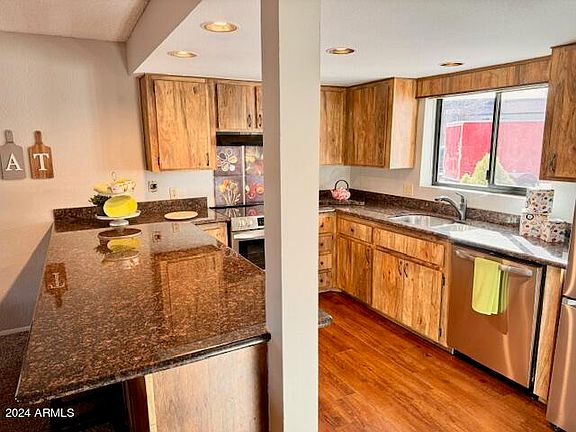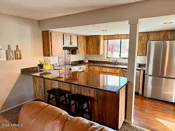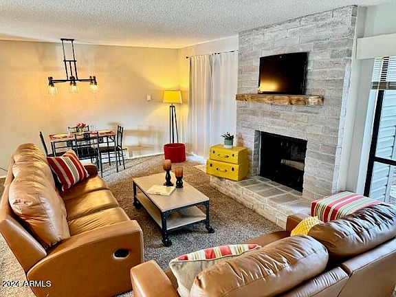 Sought after clean, light and bright, end unit, lower level condo in the cool pines of Munds Park! This upgraded condo can be used year-round and has 3 bedrooms 2 baths, brand new, never used appliances, new fixtures, granite in kitchen and bathrooms, recessed lighting, wood burning fireplace, new interior paint, large outdoor storage shed, new front and back trex deck, newer carpet and vinyl wood plank flooring, new energy efficient wall heaters. Large master bedroom with kitchenette has separate entrance to back deck and full bath with walk-in closet. This condo also has private, front entrance and can be closed off from rest of condo and used as a studio apartment or guest suite. Split floor plan with 2 additional bedrooms and a full bath on the opposite side of the living area This well-maintained condo has been newly decorated and has plenty of closet space and comes fully furnished! Enjoy the views of the ridge and the back nine of the well- known Pinewood Country Club Golf Course.