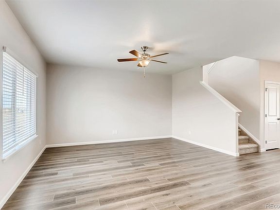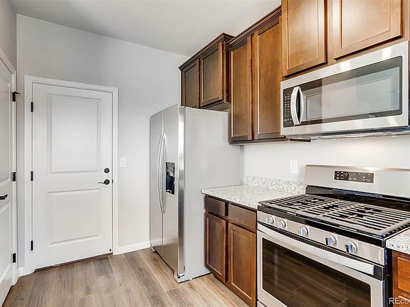 This beautiful new-construction home accommodates all of your desires in a spacious two-story layout designed to enhance your love of home. Three spacious bedrooms provide the space you need to relax at the end of the day. Two full bathrooms plus a powder bath for guests allow for additional privacy. Stainless steel Whirlpool® kitchen appliances, quartz countertops, 42-inch upper wood cabinets in the kitchen, recessed LED lights in the kitchen, stylish plank flooring, 2-inch blinds on every operable window and so much more are included in this home. Other incredible features of this home are the covered porch at the front of the home and the covered patio in the back. Located in Commerce City, the charming community of Second Creek Farm offers peaceful surroundings, picturesque landscaping, and a community park.