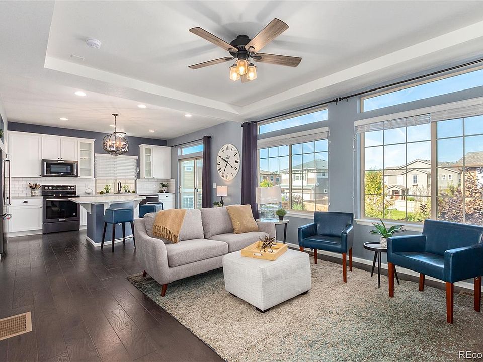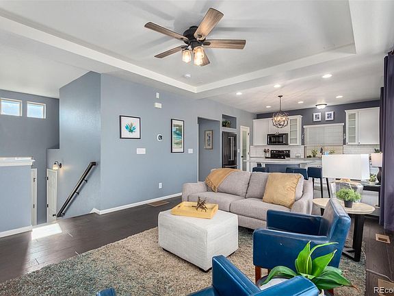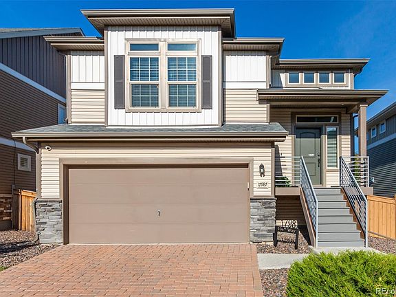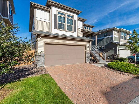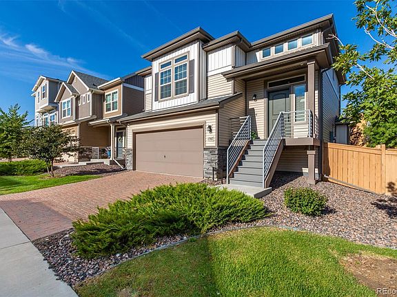 This remarkable bi-level property displays stone accents, a lush grassy front yard (maintained by HOA), a 2-car garage with a private drive and private paver driveway (upright freezer included), and a delightful front porch, great for greeting guests. Home comes equipped with security cameras both exterior and interior and a smart Thermosat. You'll love the sophisticated interior showcasing an open floor with abundant natural light, tall ceilings, and beautiful engineered hard wood flooring on the main level. The heart of this home is the gourmet kitchen! It features sparkling gray stainless steel Kitchen Aid appliances, recessed and decorative light fixtures, crisp white slow-close cabinetry with crown moulding, ample counter space, subway tile backsplash, walk-in pantry, and an island with a breakfast bar. The cozy family room/flex space on the lower level has carpeting, lots of windows, and a sliding glass door, merging the interior with the outdoor living. The primary bedroom on the main level is a good size with a walk in closet and access to the 3/4 bath. Enjoy the balcony with an awe-inspiring view of the blue sky, excellent for your morning coffee or evening cocktail. The spacious backyard, with a storage shed and a covered patio is perfect for entertaining. Don't forget the fantastic amenities this Master Planned Community has to offer! This home is right down the street from the Reunion coffee house and rec center and pool. Also, just minutes away from shopping, dining hubs, schools, efficient highway access, and more. Come check out this stunning home!! This property won't last long!***Preferred Lender offering 1year, 1% interest rate buydown. Contact Alyssa Mathieu with Fairway Mortgage at 720-778-1782 or alyssa.mathieu@fairwaymc.com for more info!***
