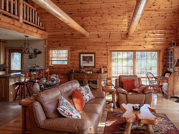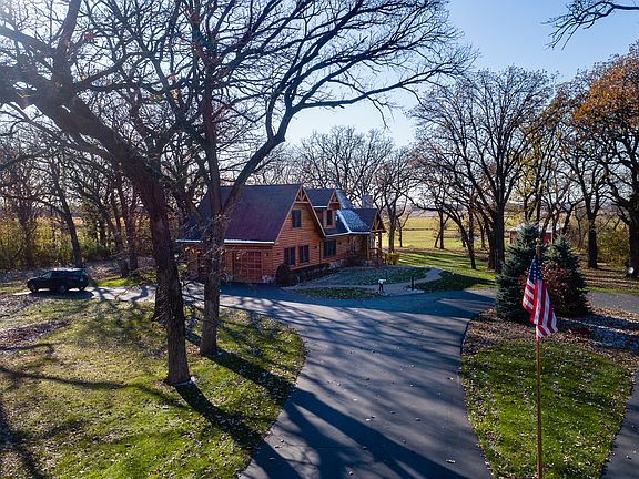 A one a kind home that boasts 8.5 acres of beautiful tree lined property with a long paved circular drive, stocked pond, and you can bring your horses or chickens! Conveniently located 2 miles from the I-90 Interchange providing quick access to Schaumburg or Rockford areas. Luxury log home with soaring ceilings and floor to ceiling windows provides the most tranquil views of this outdoor paradise. But inside you'll find an open concept floor plan providing gleaming hardwood and custom tiled inlay floors, wood burning stone fireplace, Gourmet island kitchen with high-end stainless appliances, quartz & granite counters and custom 42" hickory cabinetry. Separate dining room with built-ins. Upstairs a master bedroom retreat, walk-in closets, private luxury bath, dual raised vanities, whirlpool tub and separate shower. 2nd bedroom, full bath and loft area finish off the 2nd floor. The walk-out lower level has radiant heat floors with family room opening to patio, and 3rd full bedroom and bathroom. Additional features include 11.5" insulated wall thickness and updated HVAC for the most energy efficiency. Finished garage with epoxy flooring. Completely refinished siding and deck. 30x40 pole barn and loft with full power. Shed and chicken coop. This home is in perfect move in condition!