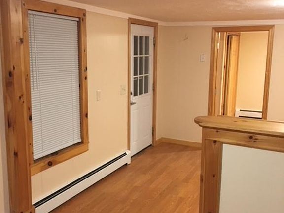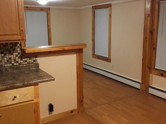 First floor, off-street parking, W/D hookup, heat included, direct access to basement storage, and front patio. First, last, and deposit required. Lease minimum one year.