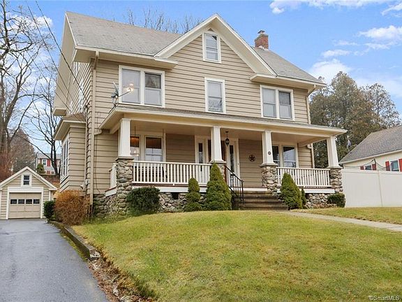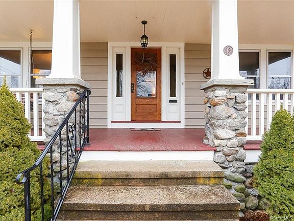 Call Pat Blanko 203-206-9194! Enjoy the view from the swing on the stone-columned front porch of this well maintained 3+ bedroom Colonial loaded with charm, classic design and modern updates! Authentic trim work, stone front, leaded glass door knobs, leaded glass door with sidelights opens to the entry foyer; double set French doors to the front to back living room with brick fireplace and additional French door. Also double French doors to the formal dining room with butler's door to the expansive kitchen. Kitchen features stainless steel appliances, breakfast bar and eating area/breakfast nook and access to the covered porch. Hardwood floors throughout the house (except kitchen). The second floor includes generous sized Master bedroom with adjacent 3 season sunroom, two additional bedrooms Plus a second floor office/study/4th bedroom with custom built-in bookcases. Sits on .39 acres (a double lot!), level fenced (2015) yard with blacktop driveway, 1 car garage. Exterior painted 2015. New furnace and hot water heater (2017) Call Pat Blanko 203-206-9194!