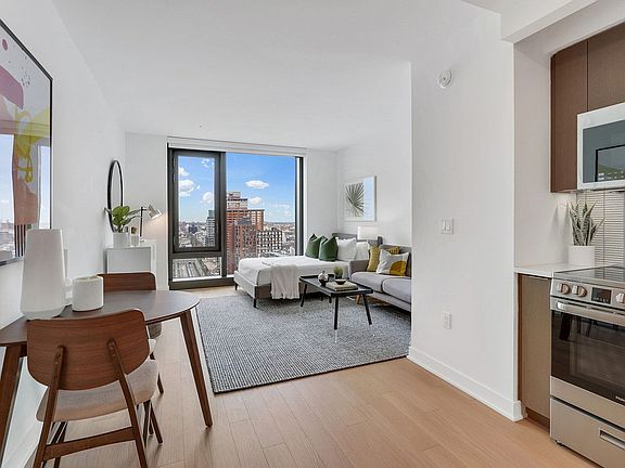 Our apartments can be experienced virtually with a 3D walkthrough or with a video call with one of our agents. APARTMENT DESCRIPTION: Bright East facing studio with generous storage, in home washer/dryer and floor to ceiling windows. BUILDING DESCRIPTION: Designed by Perkins Eastman, with amenities designed by Lemay + Escobar, Brooklyn Crossing offers 51 stories of custom-appointed residences and amenities to create the next chapter in your life story. Studio and 1- to 3-bedroom apartments, with resident amenities designed for being still or being in the center of the action, whenever you choose. Here, space abounds to stretch solo or spin with friends in the expansive fitness center, make it a movie night in the resident Screening Room, or people-watch on the open-air rooftop complete with a Sky Lounge, outdoor pool, and 360-degree views stretching from the Manhattan skyline to Rockaway Beach. Situated in prime Prospect Heights, you're minutes from epic culture and culinary fare in every direction, including historic landmarks like the Brooklyn Academy of Music and dynamic new destinations like Barclays Center. Add to that 10 train lines one block away, and really, you can go anywhere you want from here. Smoking allowed:No