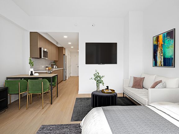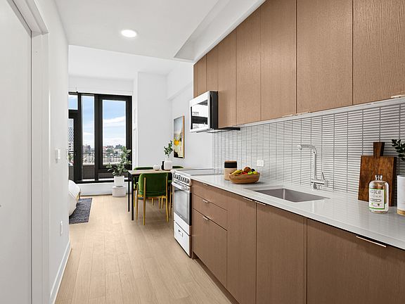 Our apartments can be experienced virtually with a 3D walkthrough or with a video call with one of our agents. APARTMENT DESCRIPTION: East facing studio with private terrace for sun soaked mornings. Generous storage space, standing shower and in home washer/dryer makes for an ideal home. *Photo may not be of actual unit but are representative of interior finishes. BUILDING DESCRIPTION: Designed by Perkins Eastman, with amenities designed by Lemay + Escobar, Brooklyn Crossing offers 51 stories of custom-appointed residences and amenities to create the next chapter in your life story. Studio and 1- to 3-bedroom apartments, with resident amenities designed for being still or being in the center of the action, whenever you choose. Here, space abounds to stretch solo or spin with friends in the expansive fitness center, make it a movie night in the resident Screening Room, or people-watch on the open-air rooftop complete with a Sky Lounge, outdoor pool, and 360-degree views stretching from the Manhattan skyline to Rockaway Beach. Situated in prime Prospect Heights, you're minutes from epic culture and culinary fare in every direction, including historic landmarks like the Brooklyn Academy of Music and dynamic new destinations like Barclays Center. Add to that 10 train lines one block away, and really, you can go anywhere you want from here.