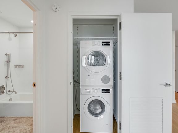 Our apartments can be experienced virtually with a 3D walkthrough or with a video call with one of our agents. APARTMENT DESCRIPTION: Well designed North facing 1BR home with Iconic views on the Manhattan Skyline and East River; featuring an in home washre / dryer. *Photo may not be of actual unit but are representative of interior finishes. Application Fee: $20 per leaseholder and guarantor. Security Deposit: Equal to 1-months' rent unless stated otherwise in the lease. Credit & Debit Cards Fees (for BILT): Credit Cards 3% and debit $9.95 per transaction. Credit & Debit Cards Fees (for ClickPay): Credit Cards 2.95% ($15 for VISA) and debit $9.95 per transaction (foreign transaction fee: additional 1.00% fee applies when using an international credit card). Utilities: Cable, internet, telephone, and electricity costs: Based on usage. Additional Security Deposit & Rent Increase: As required per the lease and allowed under applicable law. Renters' Insurance: Required policy (you may obtain through your preferred provider). The Guarantors or Rhino: Optional, if you use these services, their applicable fees will apply.Late Fees: 5% or $50 per instance, whichever is less. Non-Sufficient Funds Fee: $50 per instance. Key Replacement Fee:$20Key Fob Replacement: $20Key Cylinder/Lock Replacement: $150 Damage Fees: Billed at cost for damages beyond normal wear and tear. Legal Fees: Billed at cost, as permitted by law. Cable/Internet/Phone: Optional - supplied by independent providers. For electricity there are 3 possibilities depending on the property: 1) No fee, 2) Electricity charge from independent provider, based on usage, 3) Electricity charge from landlord, based on usage. Lounge/Party Room Event Fees: As billed by the hour, optional - if availableBicycle Storage Fee: Optional $25 per month, per bike. NOTICE: This is a no fee apartment available for rent directly to the public. Owner will not charge or collect or pay any brokers' fees. Owner does not authorize any broker to relist this apartment for rent. Brokers must present a prior agreement between the broker and any prospective tenant in which the tenant has hired the broker and agreed to pay the broker's fee. Without such agreement, broker will not be permitted to show the apartment. BUILDING DESCRIPTION: Designed by Perkins Eastman, with amenities designed by Lemay + Escobar, Brooklyn Crossing offers 51 stories of custom-appointed residences and amenities to create the next chapter in your life story. Studio and 1- to 3-bedroom apartments, with resident amenities designed for being still or being in the center of the action, whenever you choose. Here, space abounds to stretch solo or spin with friends in the expansive fitness center, make it a movie night in the resident Screening Room, or people-watch on the open-air rooftop complete with a Sky Lounge, outdoor pool, and 360-degree views stretching from the Manhattan skyline to Rockaway Beach. Situated in prime Prospect Heights, you're minutes from epic culture and culinary fare in every direction, including historic landmarks like the Brooklyn Academy of Music and dynamic new destinations like Barclays Center. Add to that 10 train lines one block away, and really, you can go anywhere you want from here. There is an optional amenity fee of $95 per person, per month.
