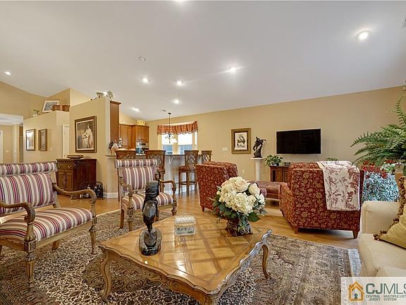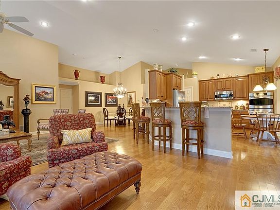 The Martinque model upgraded home in a premier location has been impeccably decorated. Features include 3 bedrooms & 2 full baths, spacious kitchen boasts stainless steel appliances,double wall oven, 5 burner stovetop, granite counters, wood flooring throughout except in bedrooms. Home has an extended master bedroom suite with vaulted ceilings, recessed lighting, full bathroom including a jacuzzi jet tub, stall shower, granite counters & double sinks. Open floor plan also includes a formal dining area and living room. There is a finished space for storage above garage. Systems are tankless water heater, furnace was upgraded in 2009 to a 2 stage system and central air conditioning. Community has a 29,000 sq. foot clubhouse with anindoor and outdoor pool, tennis courts, fitness center, library, event room, putting green and game rooms. Close to shopping, routes 33 and 9.Showings begin Saturday 10/10.