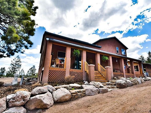 Meticulous Mountain Splendor!! Beautiful home with unique character & picturesque setting with over 4,000 sq. ft. of living space. Spacious great room with floor to ceiling fireplace wall & river rock pillars with vaulted tongue/groove pine ceilings & 20 ft. high windows! Sip your morning coffee on one of the two re-stained rear decks overlooking Pikes Peak & the gorgeous mountain vistas! Master BD is totally distinctive with gas fireplace & tv nook wrapped in river rock, spa-like executive master bath & beautiful log railing leading to the master BD with walk-out balcony & office. Front decking sanded & re-stained for evening relaxation & soaking in the clean mountain air! High end kitchen appliances with new Smart double oven & water purifying system, custom maple cabinetry as well as custom tile & lighting. Partially finished 2 BD & stubbed out bath in walk-out basement. Well and additional 1,200 gal. underground cistern. One yr. Home Warranty. Also a permitted precipitation water recovery system in the basement with a 3,000 gal. capacity which includes pump & filtration system. Geothermal well on premises.The two adjoining lots also available for 5.38 acres. Many upgrades-ask!