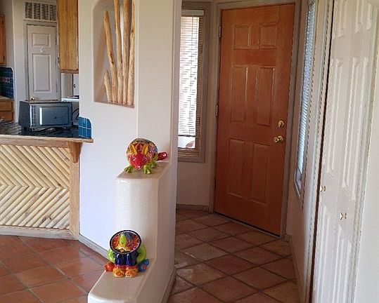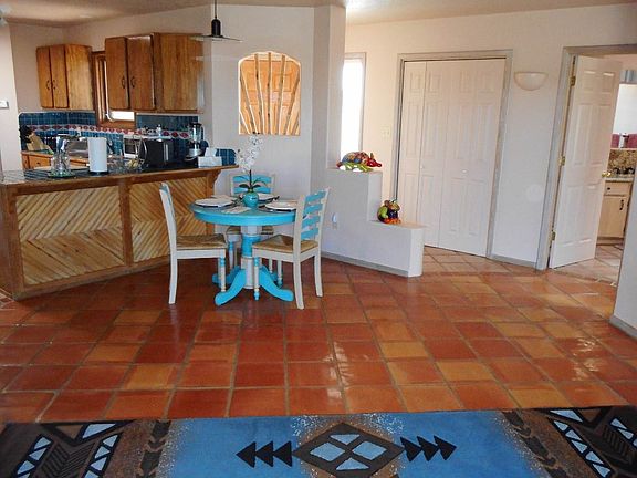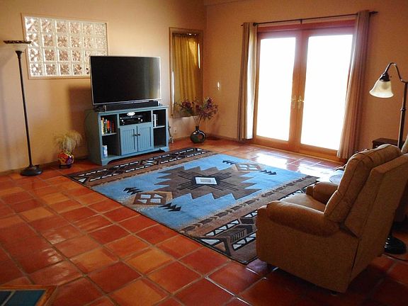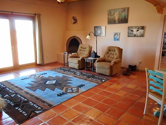 Charming, light and bright split bedroom design, custom built by Lacy Construction. Vigas, beams and latillas in both living areas and master bedroom. Kiva fireplace in the living room and patio doors lead to a large fenced yard with stunning mountain views! The master bedroom has an additional roof stack for a wood-stove or fireplace to be added. Saltillo tile floors throughout and a roomy kitchen with breakfast bar and ceramic tile counter tops. Nichos with latillas and glass block walls add character and the high ceilings add a sense of space. Large 2 car garage plus 1.67 acre lot with mountain views. Skylights make it cheerful and bright, the rooms are spacious, and the bedrooms, with their granite countertops, are on opposites sides of the house, giving good privacy. This home is a delight to show!
