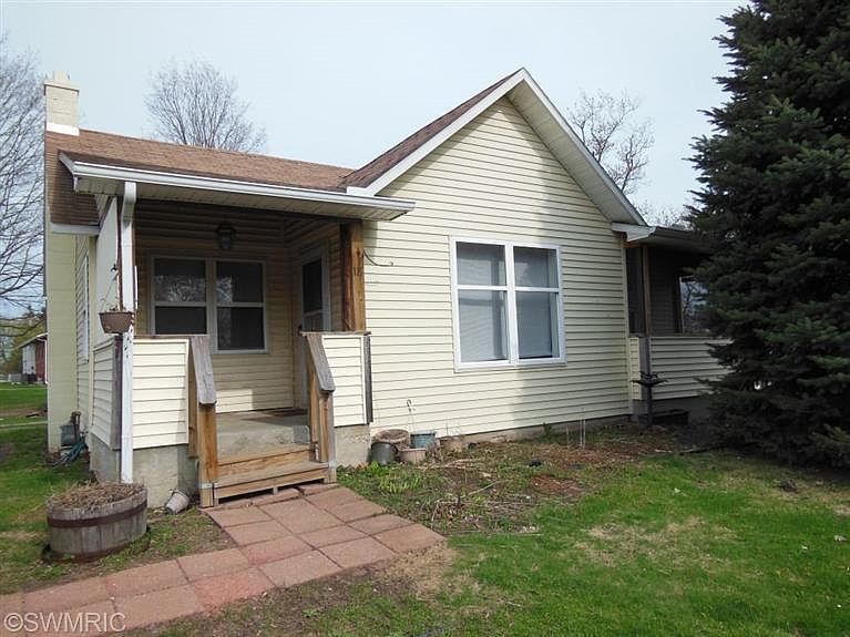 Cute 2 bedroom, 1 bath bungalow in Coldwater with an open living/dining area, vinyl siding and updated roof and windows. There are also French doors that open to the screened porch and a drive thru one car garage (with doors on each end).