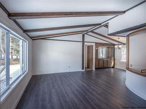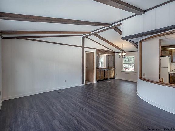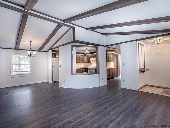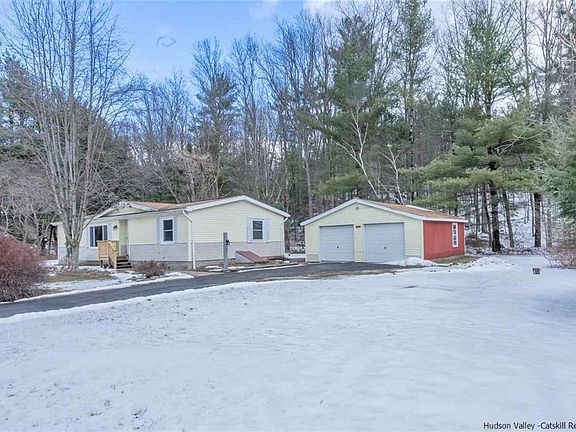 If you've been looking for a charming primary or secondary home in the countryside yet with easy access to the amenities of a small hamlet in the Catskills Park, then you've got to have a look at this unusual gem in a balanced comfy neighborhood just 20 minutes from the city of Kingston. At just over 1,000 sq. ft, this ranch home has a practical layout with the master suite and its bathroom to the left of the open living/ dining areas and spacious kitchen all with beamed ceiling. The two additional bedrooms and bathroom are to the right of the communal living spaces offering privacy. Enjoy expansive and beautiful mountain views from all front facing windows. Several improvements were made to the home in recent years including a nice sized deck in the back with landscaped grounds backed up to the woods: great for just hanging out in the backyard oasis or entertaining friends and family. The 2-car garage building with workshop area offers more space and convenience which is certainly welcome during the winter months.