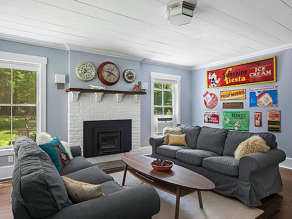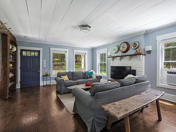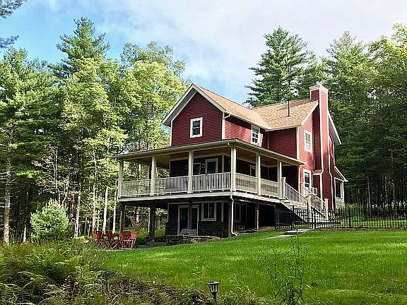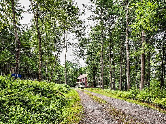 Down a long private drive, this picturesque and graciously designed farmhouse is perched on a hill surrounded by a carpet of ferns and a forest of pines and maples. Fall in love with it's sweeping views from the massive wrap around porch and the soft melodic rush of the stream below. Cedar sided the 2-story home sits on 4+ private acres. The property itself is a wonderful combination of a forest landscape with a rolling pasture bordered by a mountain creek. Set to take advantage of the position of the sun there is an extensive enclosed garden with reclaimed hinges and copper finials, organic soil and perennial plantings. The interior combines classic original details like hand hewn beams, wide plank floors, a gracious front porch with 2.5 luxurious baths, a huge chefs kitchen equipped with a 6 burner Aga including 2 ovens and a broiler, a spacious walk-in pantry and new stainless high end appliances. A powder room is just off the kitchen. The entire house is propane heated with Nest thermostats which allow you to warm the house up ahead of your arrival. There is an easy to use built in grill and bluestone patio with fire pit below. The living/dining room, which flow seamlessly into one another, are divided by majestic hand hewn beams and shelves. The comfortable living room has a wood burning fireplace for winter months. Upstairs there are three spacious bedrooms along with 2 full baths. Located downstairs in the basement is a large additional--not included in the square footage--den/TV room which is separately heated. The basement, which has a dehumidifier, also includes a new washer dryer and laundry area and there is also a 220 line and plug. On a more practical note, the septic was pumped in 2021. The fridge is 2 years old and the dishwasher was replaced 4 years ago. All the railings and spindles on the deck were replaced in 2019. Most of the double pane windows throughout the house have Levolor pull down shades. The chimney was partially rebuilt in 2019 and a cap was installed. Additionally, there is a electrical and plug for a generator. Spectrum cable, internet and WiFi. There is also a Nest camera to keep an eye on the place. All that's missing is you!!