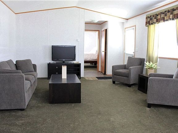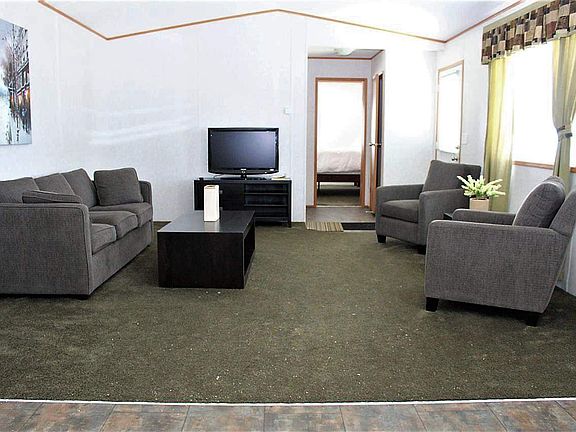 Beautiful 2011 mobile home on its own greenbelt lot. This unit comes fully furnished! Mirrored on opposite ends of the unit are spacious bedrooms with large closets and 4 piece bathrooms (one being a cheater suite). Living room and kitchen open with lots of natural light. Whether you're looking for a starter home, investment property or to downsize, this is a great opportunity. Small/minor amount of water damage from dishwasher leak on base of kitchen cabinets. Some swelling. Being sold as is where is.