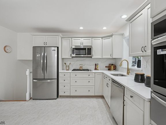 Situated on over an acre and in a highly sought-after neighborhood, this beautifully UPDATED 4-bedroom, 2.5-bath split-level home offers over 2,300 sq. ft. of comfortable living space across all four finished levels. This home welcomes you with a spacious foyer that opens to the large family room featuring a cathedral ceiling and tons of natural light, making this a great space for everyday living. A convenient laundry room, UPDATED powder room and garage access complete this level. The lovely kitchen features wood cabinets, NEW quartz counters & backsplash, NEW stainless steel Frigidaire refrigerator, wall oven & dishwasher. The formal dining and living rooms are highlighted by refinished hardwood floors. Upstairs, four bedrooms include a spacious primary suite with a walk-in closet, a secondary closet, and a fully RENOVATED private bath with a stall shower. The RENOVATED hallway bath showcases the stylish vanity and marble tile. The finished basement with NEW luxury vinyl plank flooring adds a flexible recreation or office space. Outside, enjoy an expansive deck with a built-in gas grill overlooking the private and tranquil yard. A two-car built-in garage with a large driveway, updated lighting and plumbing fixtures, modern finishes, NEW central air condenser, and fresh paint throughout, complete this move-in-ready home. With easy access to schools, shopping & dining, major highways, and NYC transit, this home offers the perfect blend of comfort, convenience, and location.